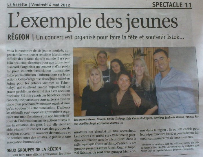 Notre équipe est composée de six jeunes motivés, sensibles à la situation difficile des enfants dans le monde. Il n’a pas fallu beaucoup de temps pour que tous soient d’accord d’organiser un concert pour soutenir l’association humanitaire » Istok « . Celle-ci organise des séjours-santé en Suisse pour les enfants victimes de Tchernobyl, qui souffrent encore aujourd’hui de graves problèmes de santé dus à cet accident nucléaire. Tous les bénéfices du concert lui reviendront.