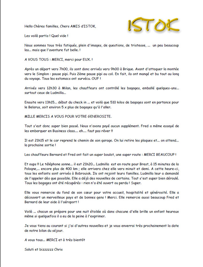 Nous espérons que cette soirée pourra rapporter suffisamment de fonds à l’association, car les séjours-santé qu’elle organise représentent vraiment une grande bouffée d’air frais pour tous les enfants qui peuvent venir ici. Non seulement ils peuvent manger des aliments non-contaminés, mais aussi ils découvrent qu’ailleurs la liberté d’expression existe. Les enfants sont très sensibles à ce genre d’expériences. Officieusement, c’est d’ailleurs pour cette raison que le gouvernement biélorusse tente de réduire les séjours-santé organisés, en rendant très difficiles les démarches à entreprendre.