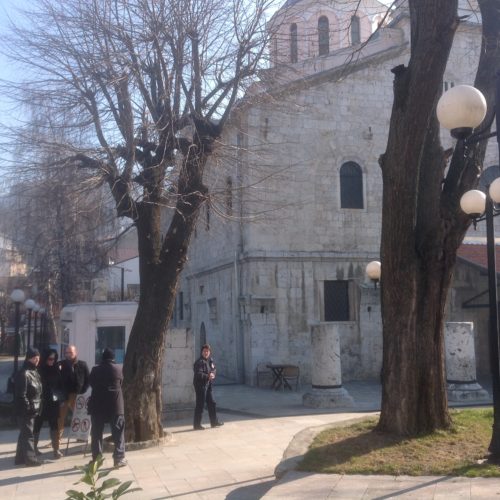 Une fois sortis de la Cathédrale « Mère Teresa », le soleil nous ayant fait l’honneur de sa présence, nous avons poursuivi notre visite de la ville en parcourant quelques stands et boutiques à proximité … Au même moment, sur la rue principale menant au gouvernement, une manifestation … Selon les propos de certains passants à qui je demandais informations, il s’agissait d’étudiants de l’Université … Midi approchant et sentant venir notre envie de nous arrêter, à l’image d’un poisson dans l’eau, Pasquale nous trouve un bar … Apéro, discussions et petite pause bien méritée dans un lieu très sympa et fréquenté principalement par des étudiants et jeunes trentenaires … Notons d’ailleurs que la population du Kosovo est composée d’environ 60 % de personnes ayant moins de 30 ans … Un pays très jeune donc avec un fort potentiel de développement …